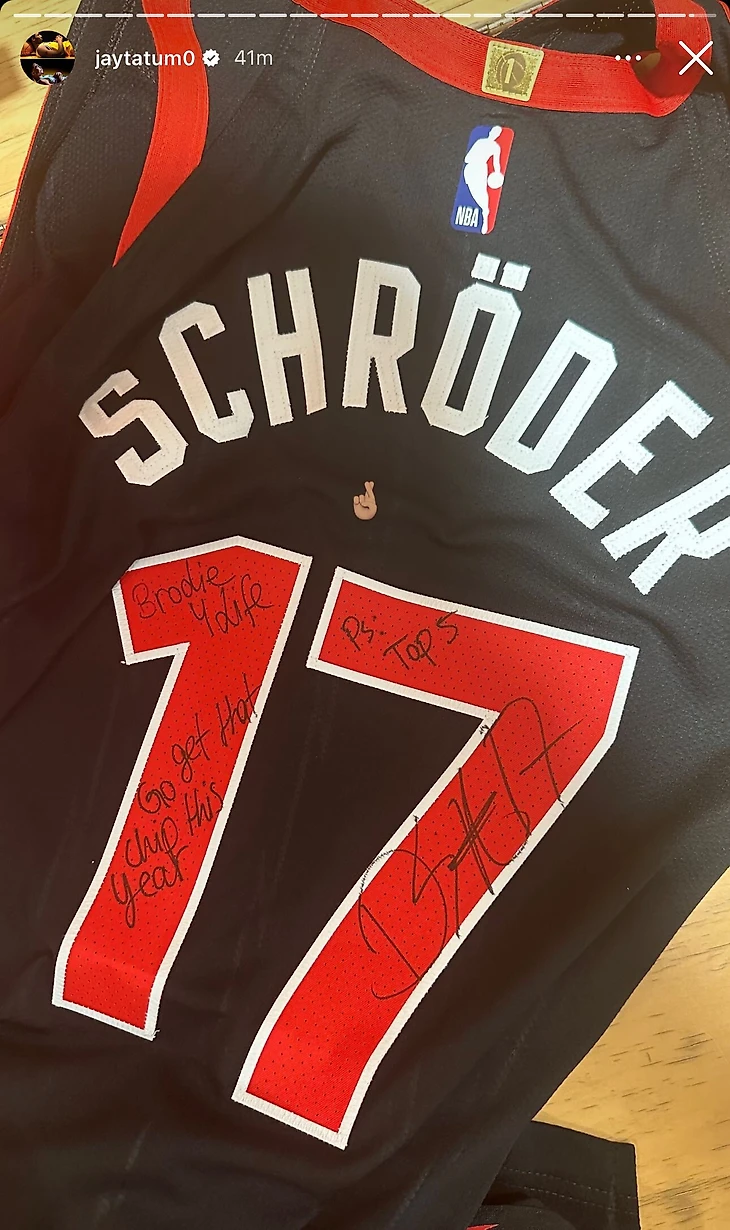 После сегодняшнего матча между «Рэпторс» и «Селтикс» (96:105) Шредер подарил Тейтуму свою игровую майку с автографом.
