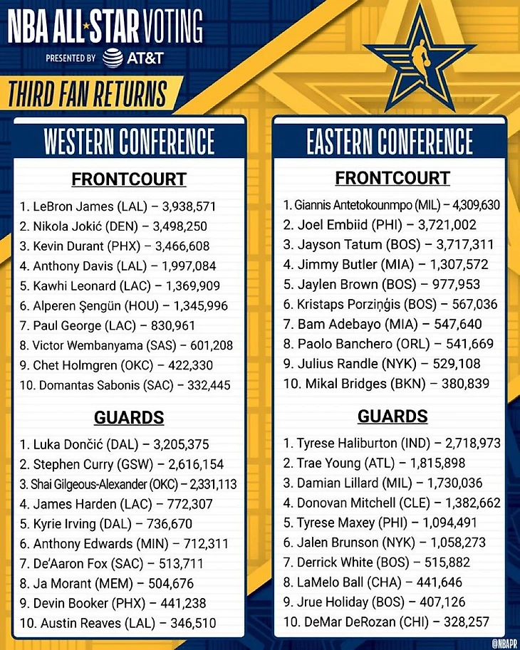 Лидерами по количеству полученных голосов в Восточной и Западной конференциях стали соответственно форвард «Милуоки» Яннис Адетокумбо (4,31 млн) и форвард «Лейкерс» Леброн Джеймс (3,94 млн).