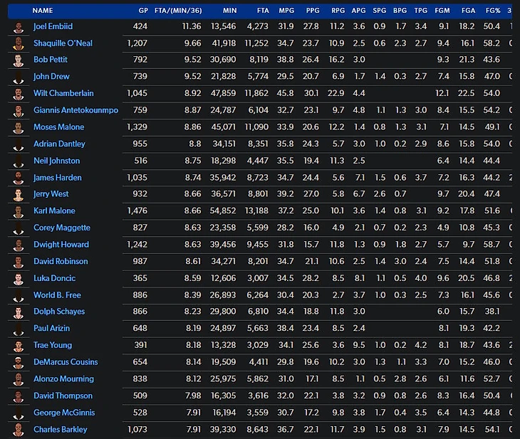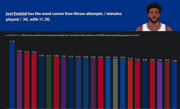 Джоэл Эмбиид чаще всех в истории подходит к линии штрафных в пересчете на 36 минут – 11,36. Отрыв от второго места такой же, как у второго от 20-го