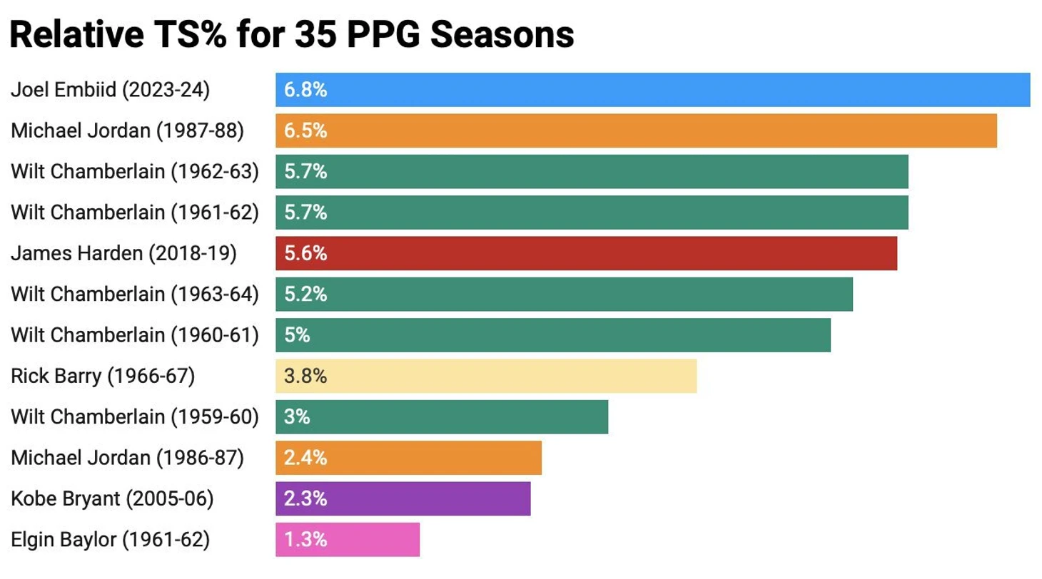 В сезоне-2023/24 центровой «Филадельфии» выдает Relative TS% в 6,8%. Это лучший сезон в истории среди всех с не менее чем 35 очками в среднем за матч. На втором месте (6,5%) расположился Майкл Джордан в регулярке-1987/88, затем – два подряд сезона Уилта Чемберлена (5,7%; 1961-1963). Пятое место занял Джеймс Харден (5,6%) в регулярном чемпионате-2018/19.