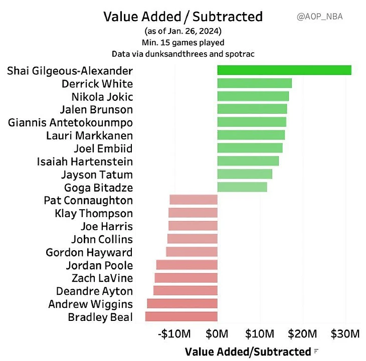 NBA University представил игроков, которые приносят наибольшую и наименьшую ценность относительно своих контрактов (исключая контракты новичков).