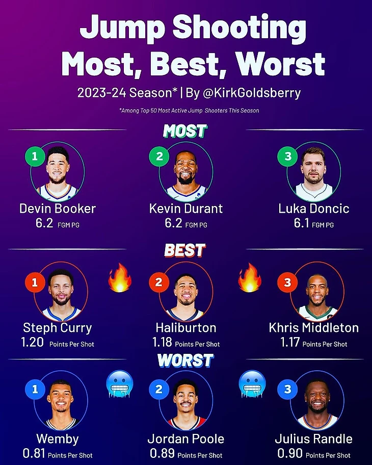 Разыгрывающий «Голден Стэйт» Стефен Карри занимает 1-е место среди самых эффективных игроков по данному показателю. Он набирает 1,2 очка в среднем на один бросок в прыжке.