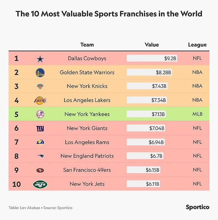 В десятку самых дорогих спортивных франшиз вошли, на местах со 2 по 4, три клуба НБА. «Голден Стэйт» (8,28 миллиарда долларов), «Никс» (7,43), «Лейкерс» (7,34).