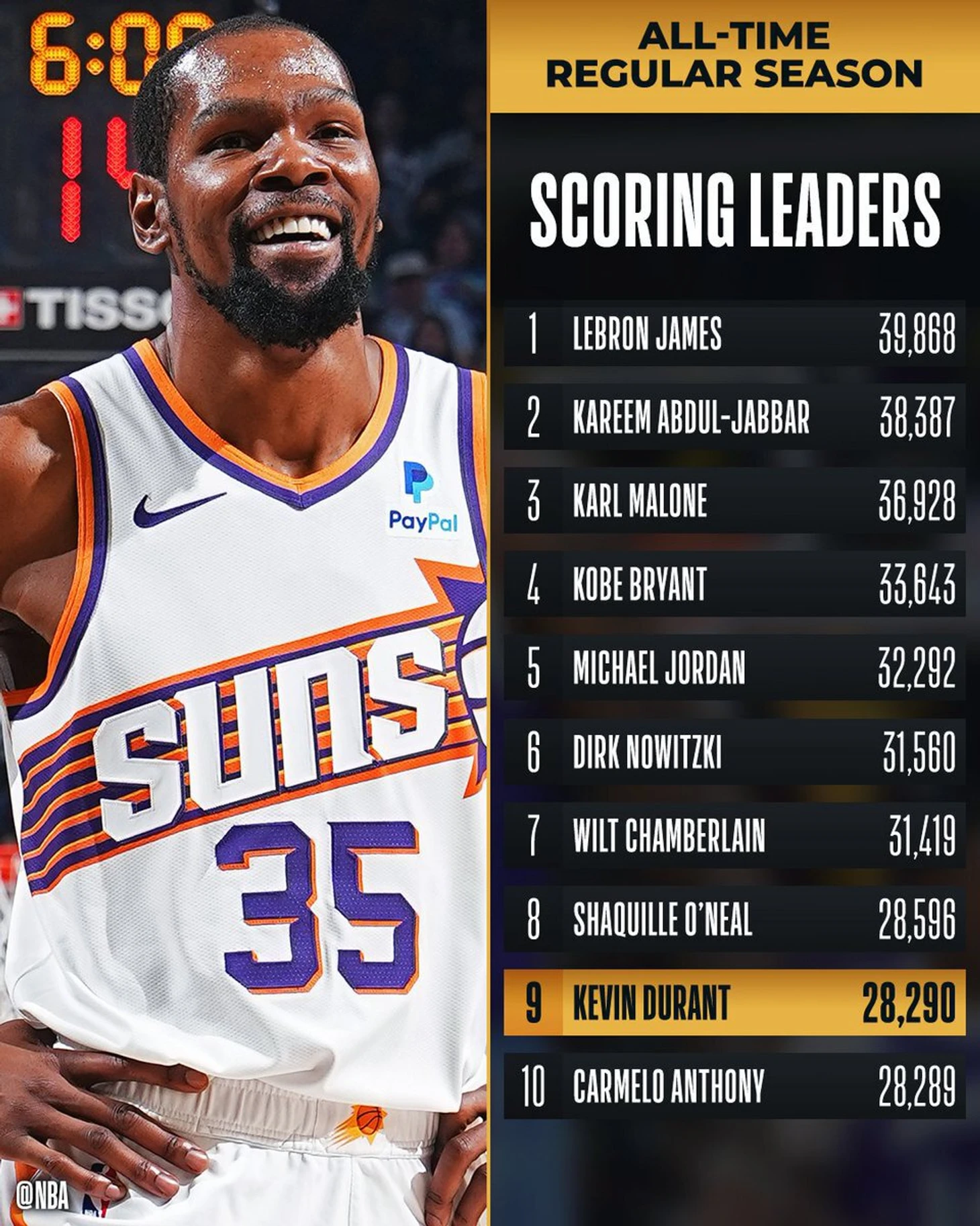 Звездный форвард «Финикса» Кевин Дюрэнт поднялся на 9-е место в истории НБА по набранным очкам.