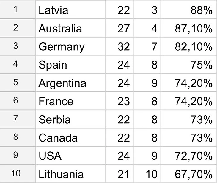 Сборная Латвии – лидер по проценту побед с 2021 года