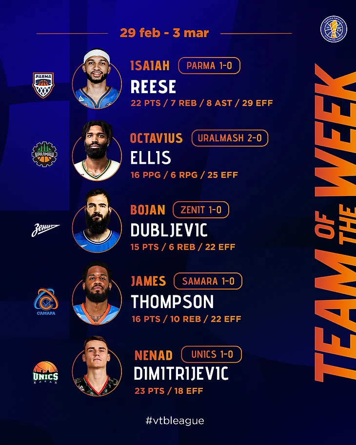 Единая лига ВТБ представила символическую пятерку игровой недели.