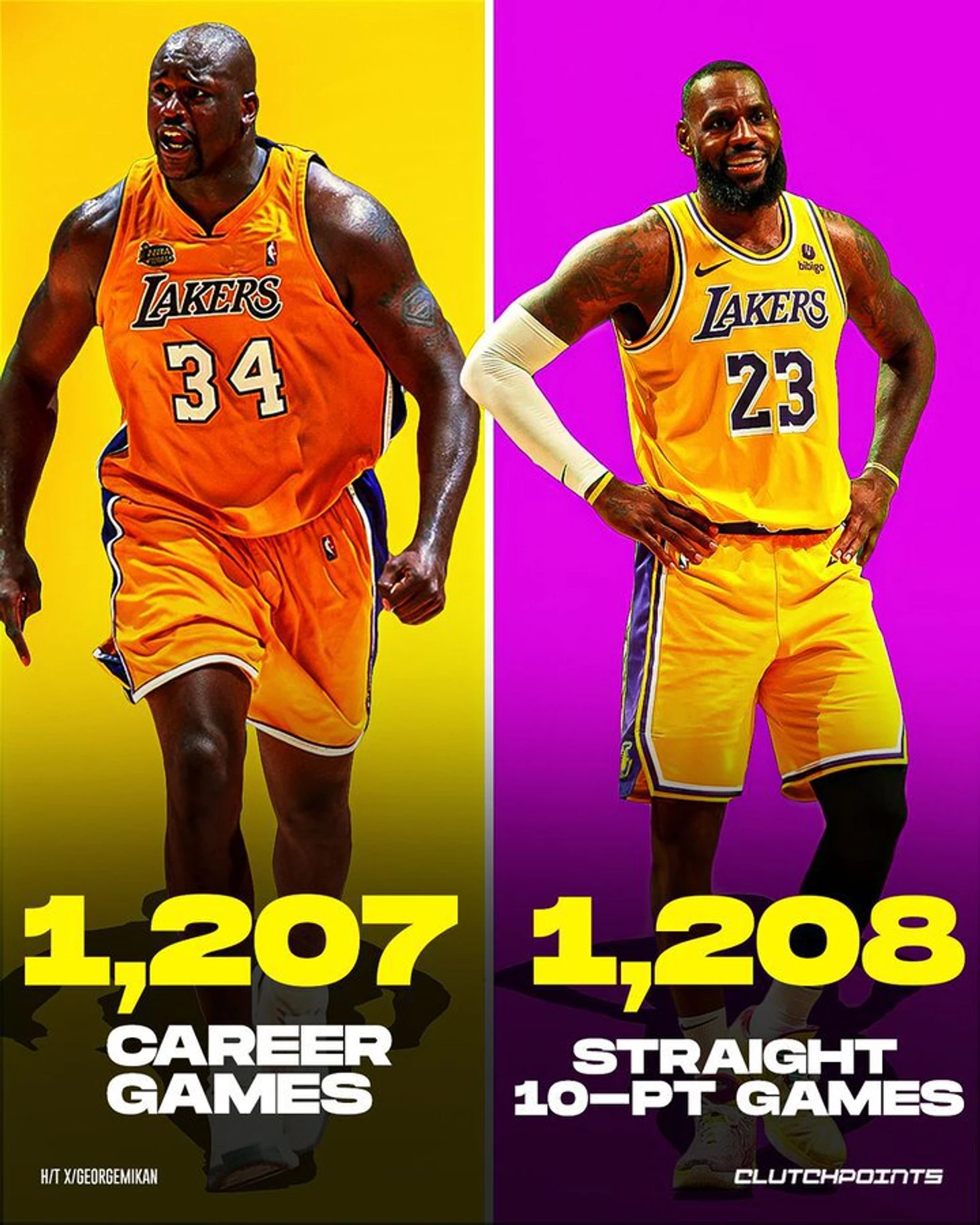 Леброн Джеймс провел 1 208 подряд матчей с 10+ очками. Это больше, чем общее количество матчей в карьере Шакила О’Нила