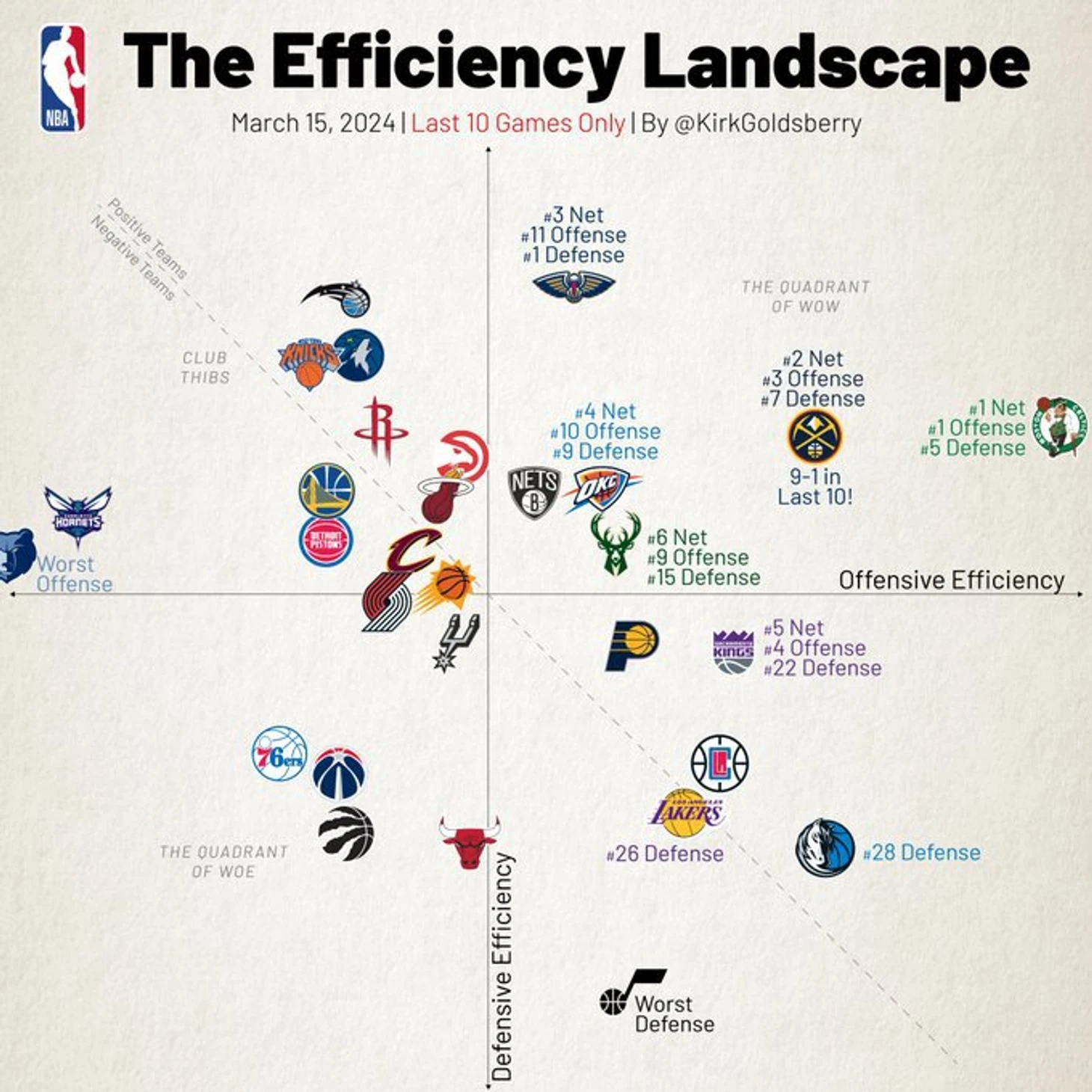 Аналитик НБА Кирк Голдсберри выложил график эффективности команд за последние 10 игр.