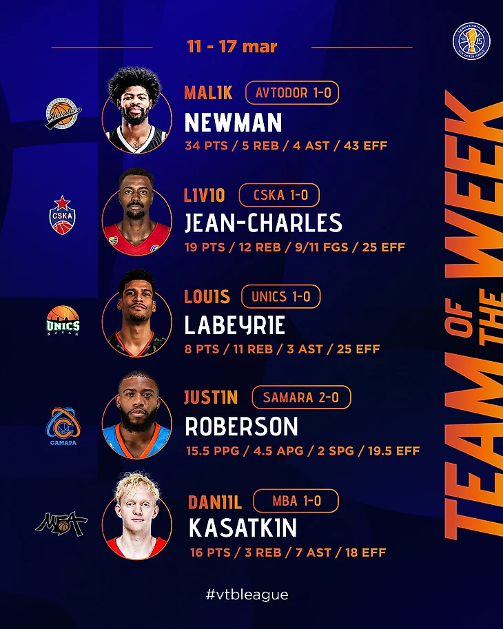 В пятерку вошли Малик Ньюмэн («Автодор»), Даниил Касаткин (МБА), Ливио Жан-Шарль (ЦСКА), Луи Лабери (УНИКС) и Джастин Роберсон («Самара»).