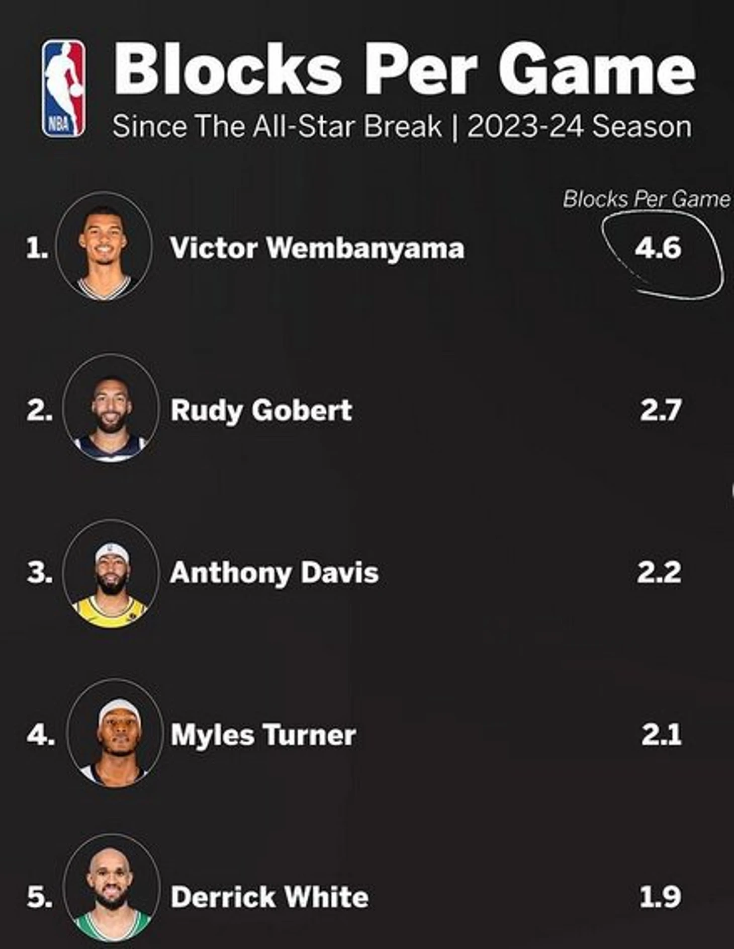 Виктор Вембаньяма набирает 4,6 блок-шота в среднем за игру с Матча всех звезд.