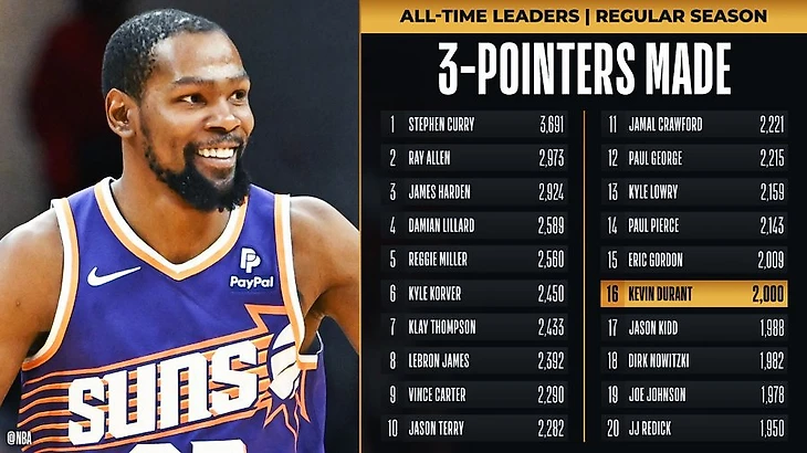 Кевин Дюрэнт стал 16-м в истории НБА, кто покорил отметку в 2000 точных 3-очковых