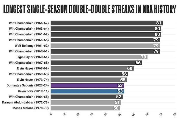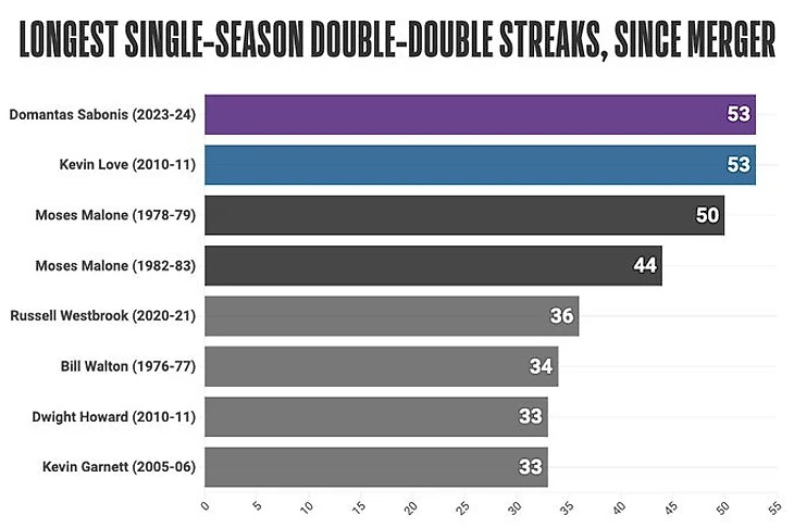 Домантас Сабонис сделал 53 дабл-дабла подряд.
