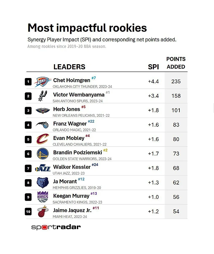Список возглавил центровой «Оклахомы» Чет Холмгрен, который с отрывом лидирует по показателям Synergy Player Impact и Net Points.