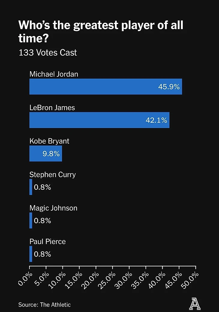 Абсолютное большинство в анонимном опросе The Athletic выбрало Майкла Джордана, Леброна Джеймса и Кобе Брайанта.