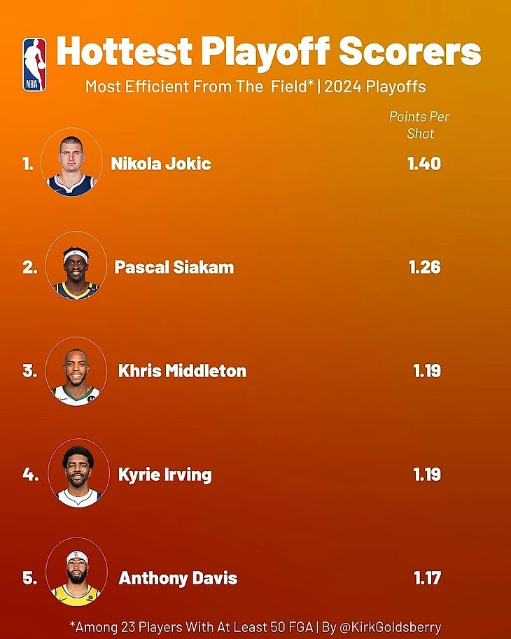 Кирк Голдсберри опубликовал пятерку самых эффективных скореров в плей-офф-2024.