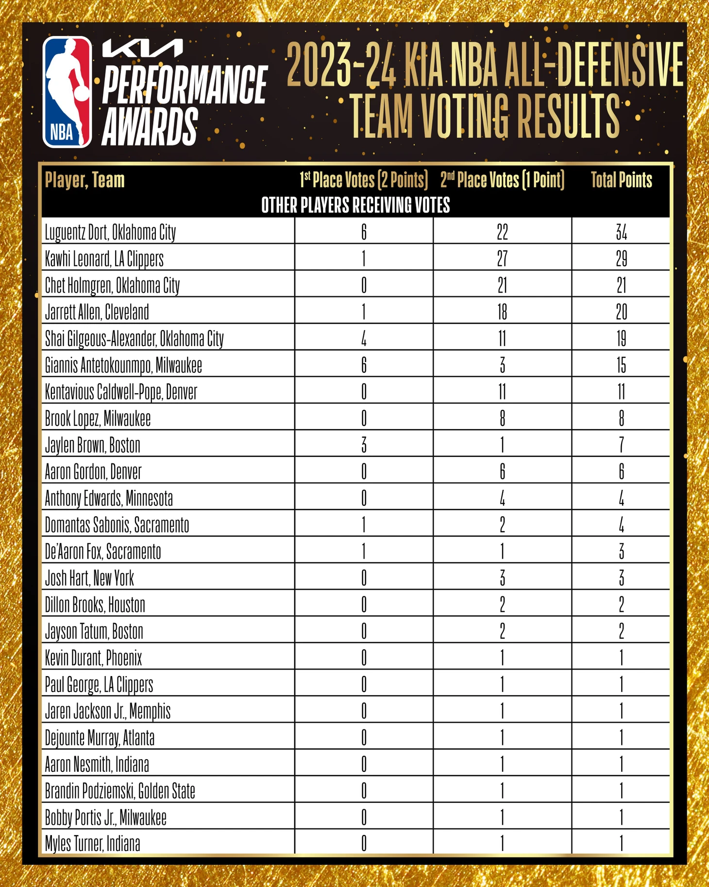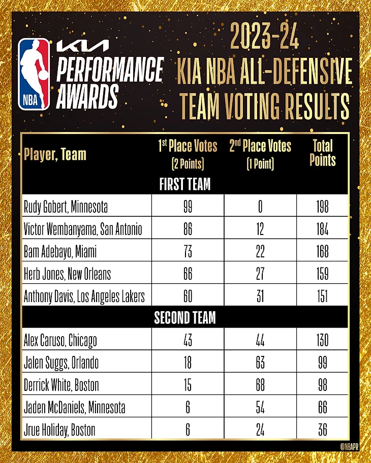 Наибольшее количество голосов за включение в 1-ю пятерку получил Гобер (99), который был признан лучшим оборонительным игроком сезона-2023/24. Новичок «Сан-Антонио» Вембаньяма занял второе место по количеству голосов (86).