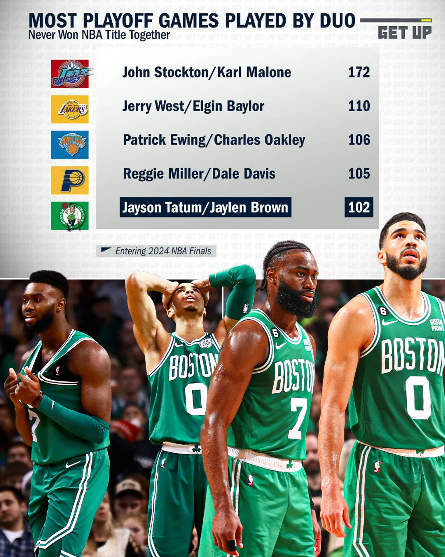 Это пятый показатель среди звездных пар баскетболистов, не сумевших взять титул чемпионов НБА друг с другом. Лидеры «Селтикс» попробуют прервать серию в финале против «Далласа» Луки Дончича и Кайри Ирвинга.