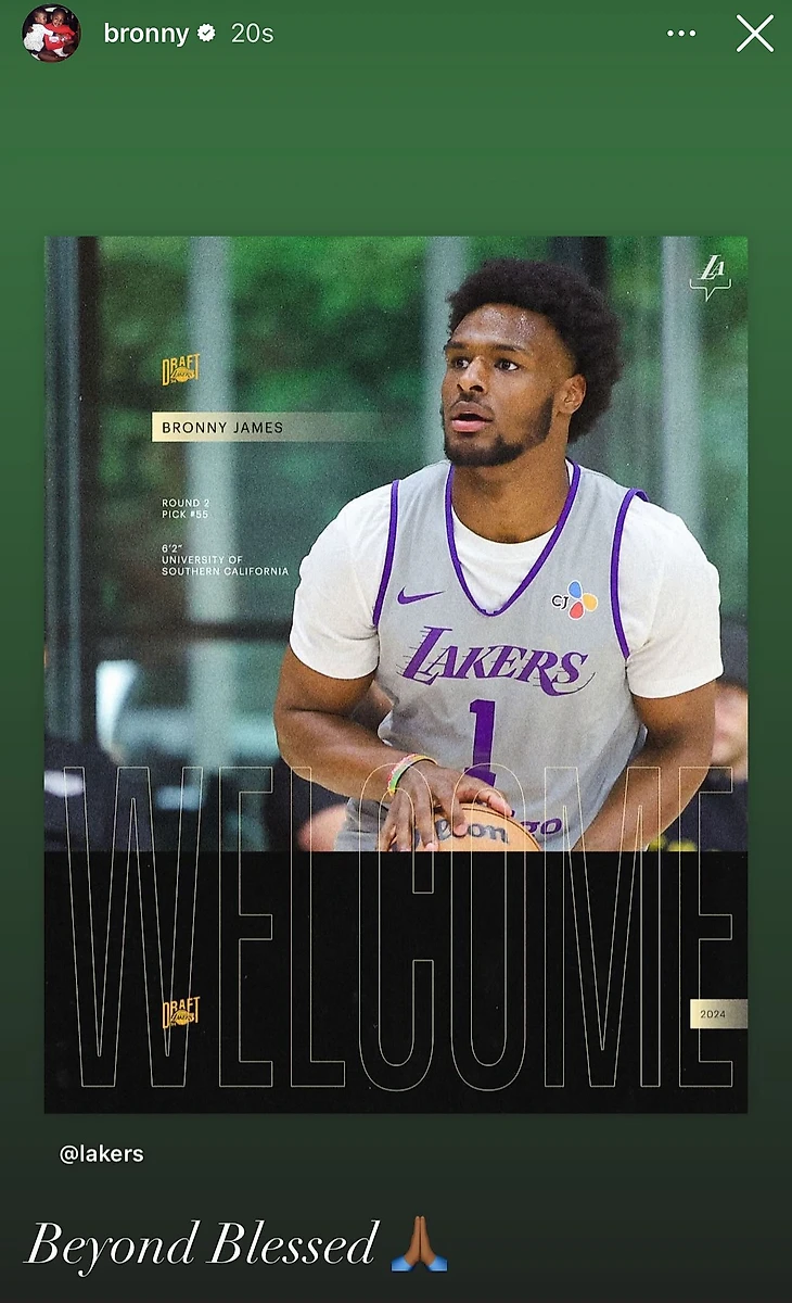 Бронни Джеймс отреагировал на выбор «Лейкерс» под 55-м номером драфта-2024.