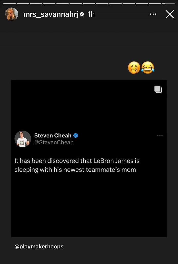 Жена 4-кратного MVP НБА сделала репост сообщения о том, что Леброн «спит с матерью своего нового одноклубника», добавив эмодзи 🤭😂.