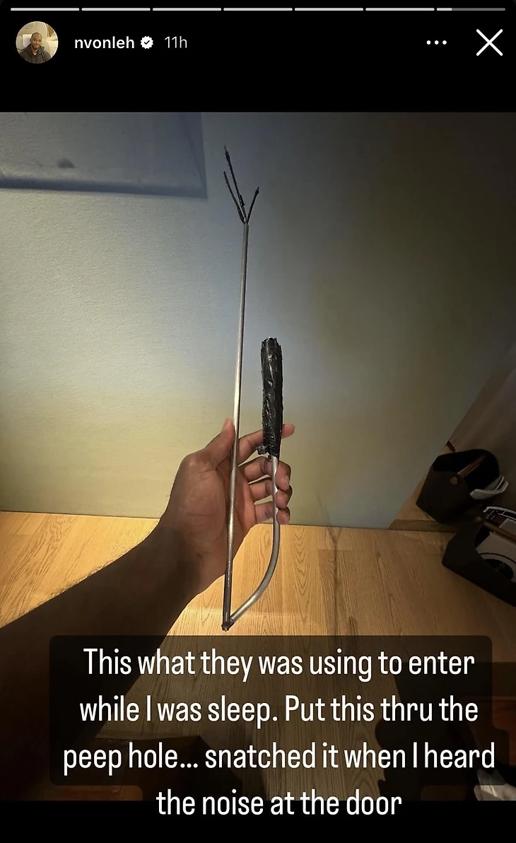 «Вот, что они пытались использовать, чтобы войти, пока я спал. Засунули эту штуку через глазок. Я схватил ее, когда проснулся от шума.