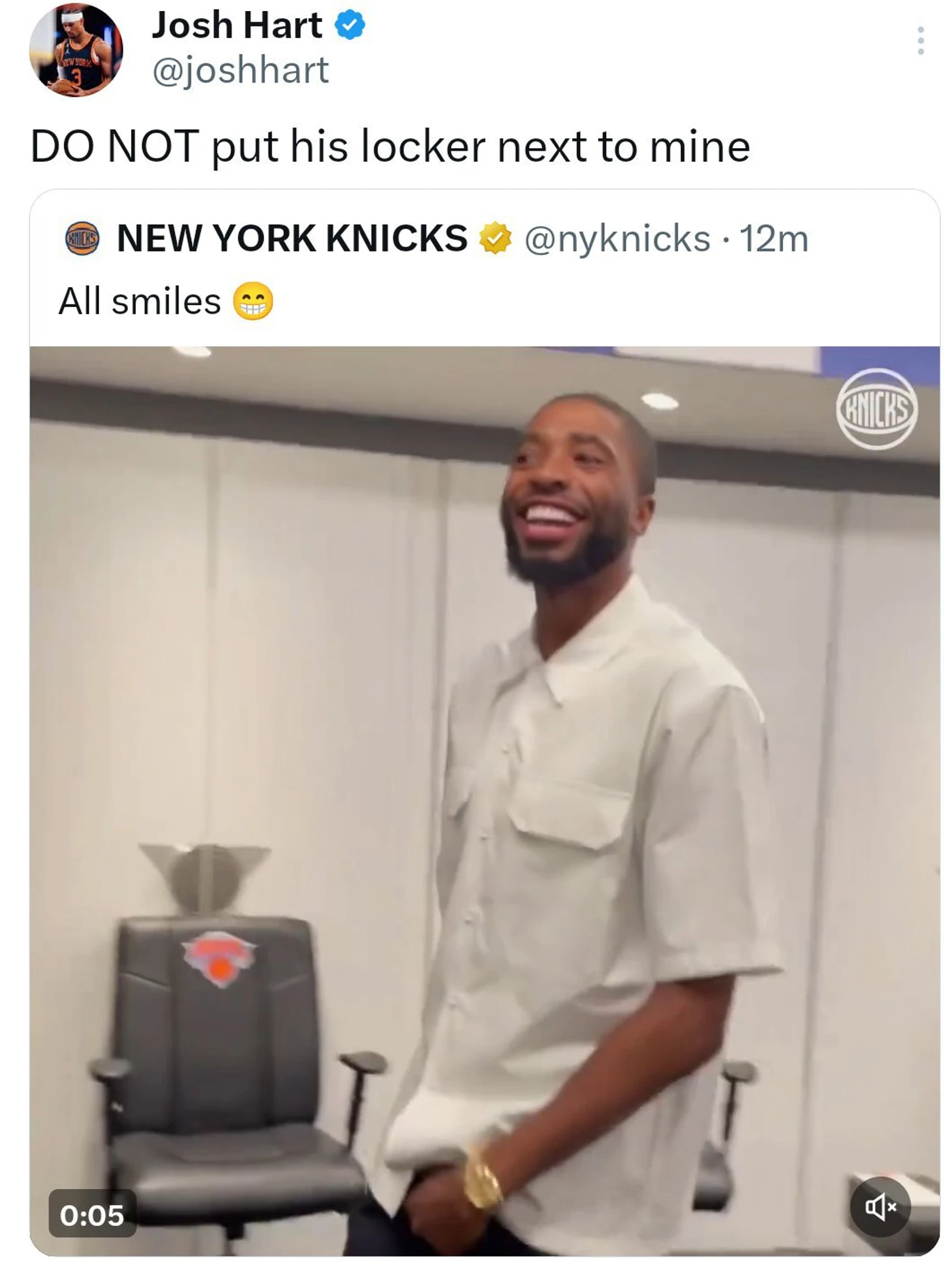 Форвард «Нью-Йорка» Джош Харт посмеялся над видео, на котором новобранец команды Микэл Бриджес впервые зашел в раздевалку «Никс».