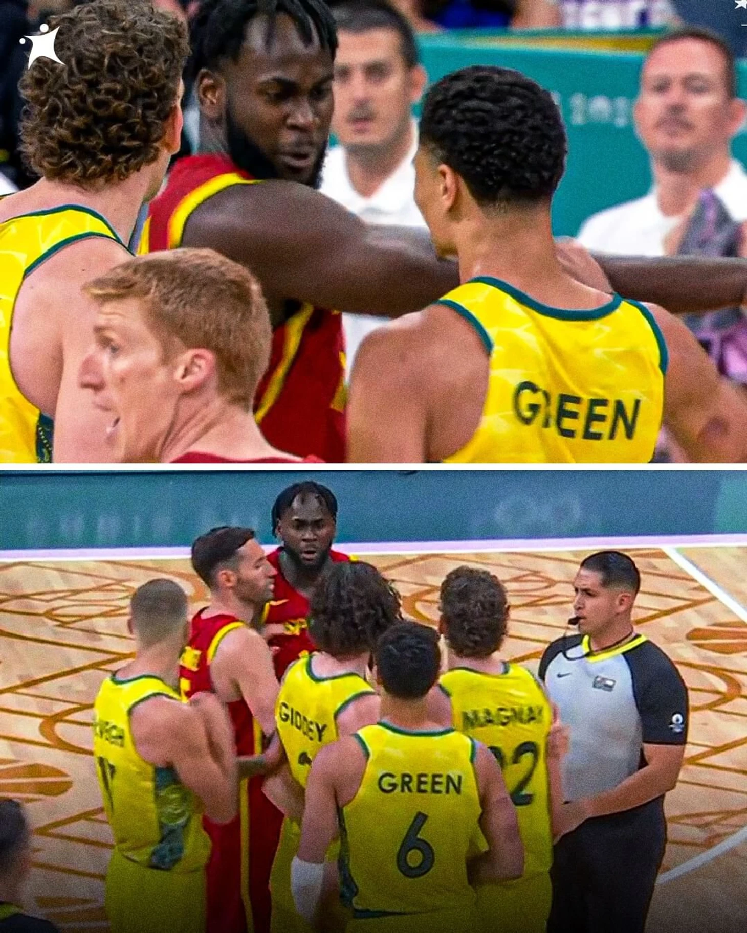 В конце первой четверти встречи между Джош Грин, Уилл Магнэй (оба – Австралия) и Усман Гаруба (Испания) вступили в стычку. В результате инцидента Гаруба и Магнэй получили неспортивные фолы за то, что толкнули друг друга.