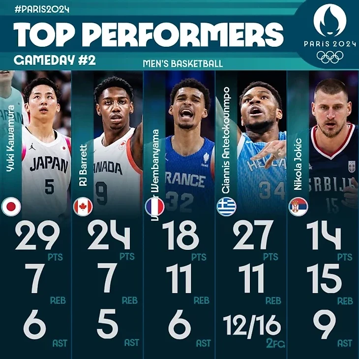 Юки Кавамура, Никола Йокич и Яннис Адетокумбо – среди лучших баскетболистов второго игрового дня олимпийского турнира