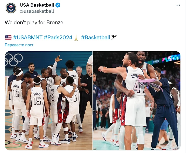 После победы над Сербией в полуфинале олимпийского турнира в тот же день в официальном аккаунте USA Basketball появился пост с празднующими успех баскетболистами сборной США.