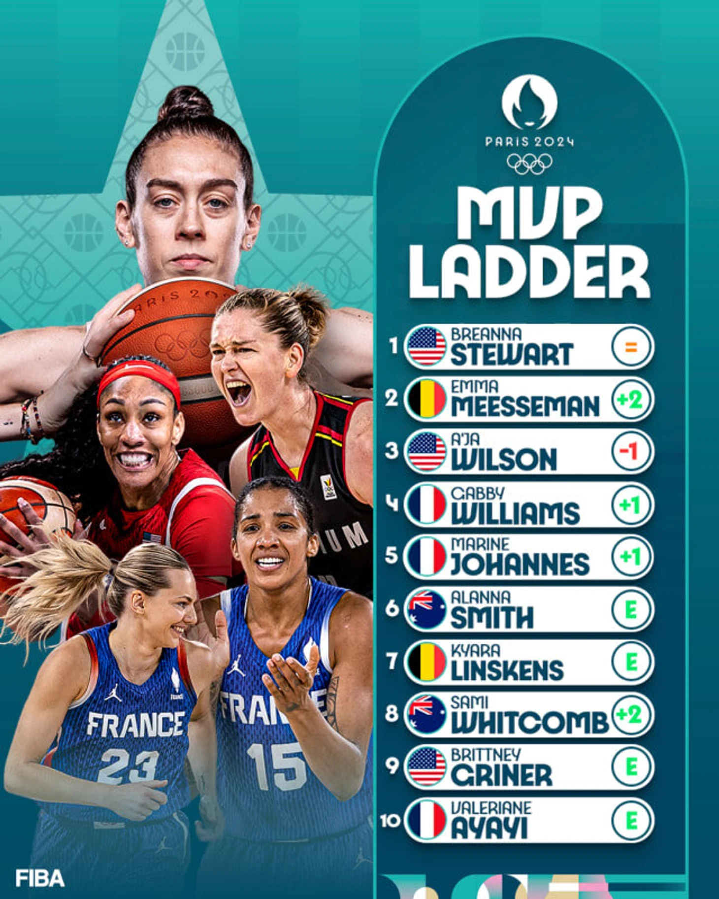 Форвард США Брианна Стюарт остается фаворитом гонки за звание MVP женского олимпийского баскетбольного турнира. На второе место поднялась форвард сборной Бельгии Эмма Мессеман, лидирующая в турнире по результативности (24,5 очка в среднем) и эффективности (30.0). На третье место опустилась форвард Эйжа Уилсон (США).