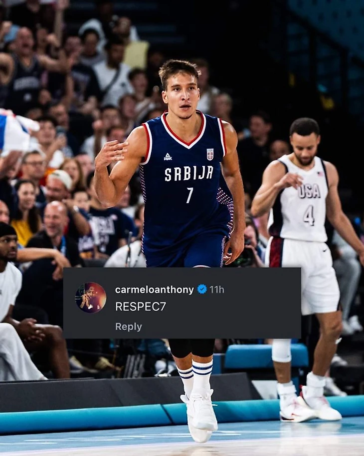 Во время второй четверти Богданович реализовал 3-очковый («+15» у сербов) и, повернувшись к Кармело, продемонстрировал его жест.