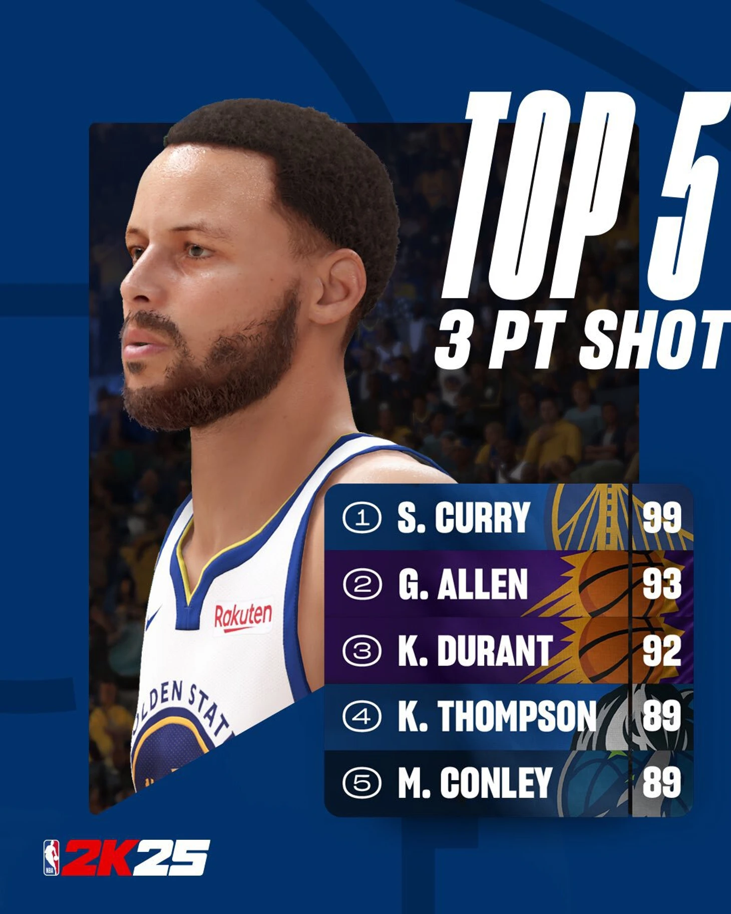 Разыгрывающий «Голден Стэйт» лидирует по точности трехочковых бросков в новой версии игры с показателем «99». Бывшие одноклубники Карри Кевин Дюрэнт («Финикс») и Клэй Томпсон («Даллас») занимают 3-е и 4-е места соответственно. Вторым стал защитник «Санз» Грэйсон Аллен.