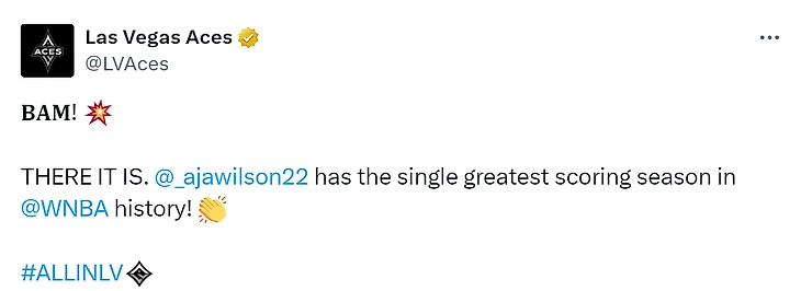 Лидер «Эйсес» недавно стала рекордсменом женской НБА по количеству набранных очков за сезон. После юбилейного попадания центровой в официальном аккаунте клуба появился пост с отсылкой к центровому «Хит».