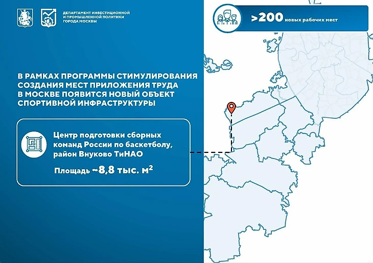 «Построим Центр подготовки сборных команд России по баскетболу в районе Внуково. Проект будет реализован за счет частных инвестиций в рамках городской программы по стимулированию создания мест приложения труда. Планируется, что площадь спортивного объекта составит порядка 8,8 тыс. кв. метров. В нем будет создано больше 200 рабочих мест. За четыре года программа охватила практически все районы Москвы. Мы заключили свыше 130 соглашений с инвесторами, которые построят новые промышленные предприятия, учреждения образования, культуры, спорта и т.д.», – написал Собянин.