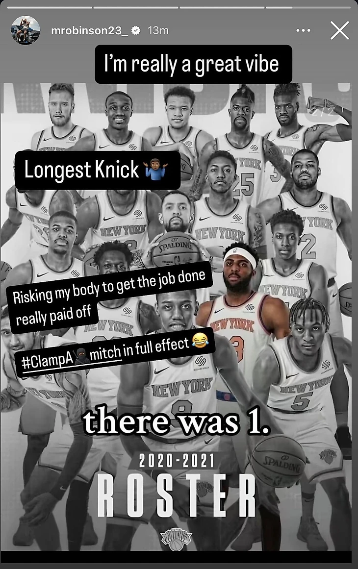 36-й номер драфта 2018 года также напомнил болельщикам, что он самый долгоиграющий баскетболист в составе «Никс». Робинсон опубликовал фотографию игроков «Нью-Йорка» сезона-2020/21, подчеркнув, что он единственный оставшийся член того состава.