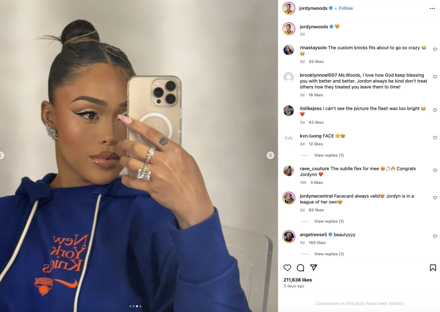 Поскольку пара вместе уже четыре года и недавно переехала в Нью-Йорк, пост вызвал слухи о том, что Таунс и Вудс помолвлены.