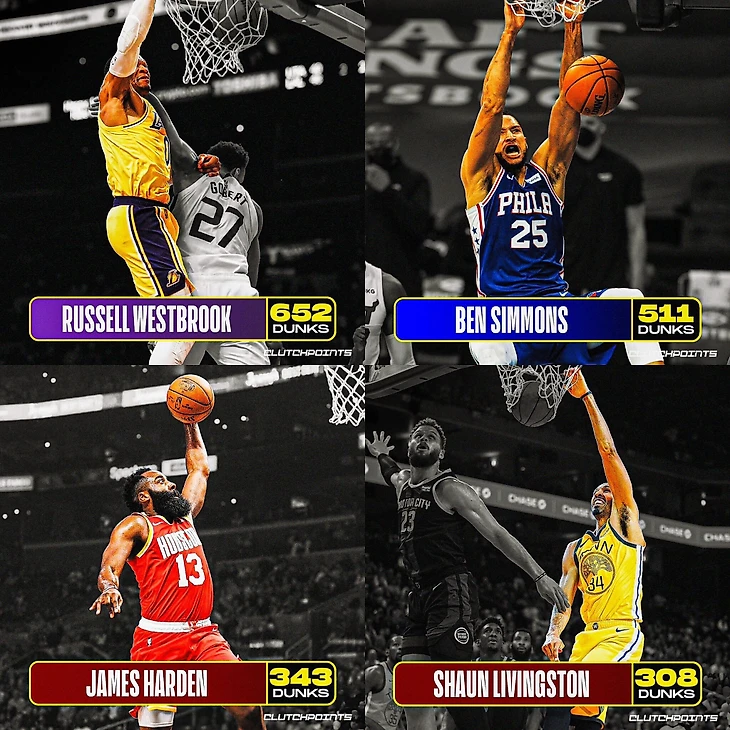 Расселл Уэстбрук лидирует по количеству данков за карьеру среди разыгрывающих. Бен Симмонс – на втором месте