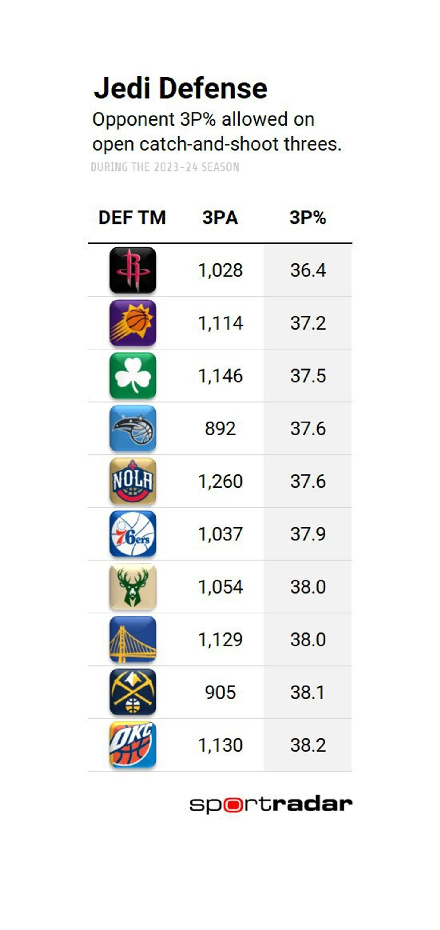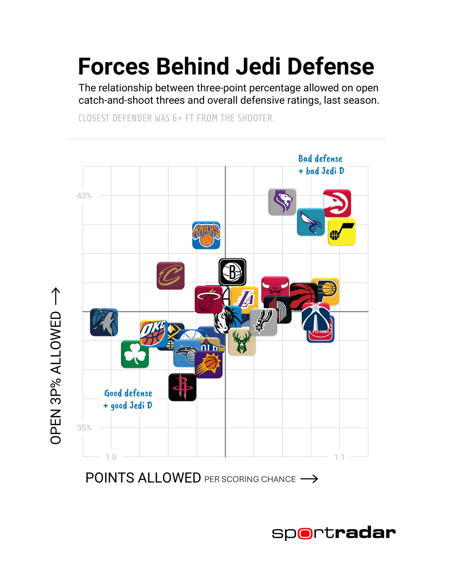 Эксперт совместил данные по открытым трехочковым броскам, пропущенным в свою корзину, и защитному рейтингу команд. Показатель пропущенных трехочковых аналитик обозначил как «джедайскую защиту» в связи с тем, что многие считают ее более основанной на удаче, чем на организации оборонительных действий.