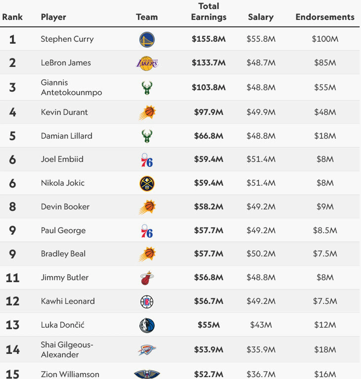 15 самых высокооплачиваемых игроков лиги заработают в общей сложности 1,13 млрд долларов в виде зарплат и спонсорских контрактов, что на 11% больше, чем в прошлом сезоне. Замыкают пятерку Яннис Адетокумбо (103,8 млн), Кевин Дюрэнт (97,9 млн) и Дэмиан Лиллард (66,8 млн).