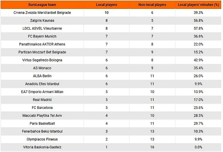 «Виллербан» лидирует среди команд Евролиги по количеству игрового времени, предоставляемого домашним игрокам (57,8%). «Жальгирис» совсем немного отстает от него в этом компоненте (56,8%). «Црвена Звезда» занимает только 4-е место по этому показателю (39,3%), уступая еще и «Виртусу» (42,9%).