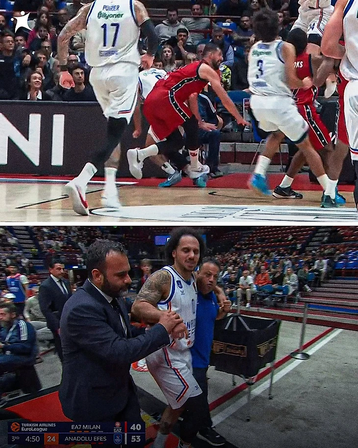 За 4:50 до конца третьей четверти разыгрывающий «Анадолу Эфеса» повредил правый голеностопный состав, защищаясь против Николы Миротича во время быстрого прорыва. Миротич пытался исполнить лэй-ап и случайно приземлился на ногу Ларкина.