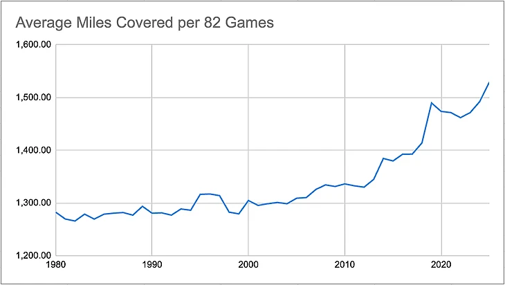 Above the Break опубликовал график, на котором видно, как с каждым годом растет расстояние, которое преодолевает на площадке одна команда в среднем за 82 матча.