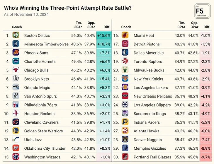 Предыдущий чемпион «Денвер» находится на 28-м месте с показателем «-7,4%». Чуть больше трети бросков «Наггетс» являются трехочковыми.