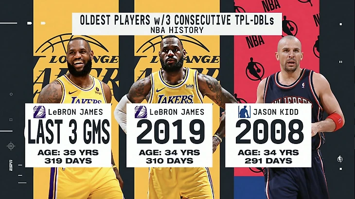 Звездный форвард «Лейкерс» является самым возрастным игроком в истории НБА, оформившим три трипл-дабла подряд. Джеймс превзошел свой же рекорд, установленный в 2019 году.