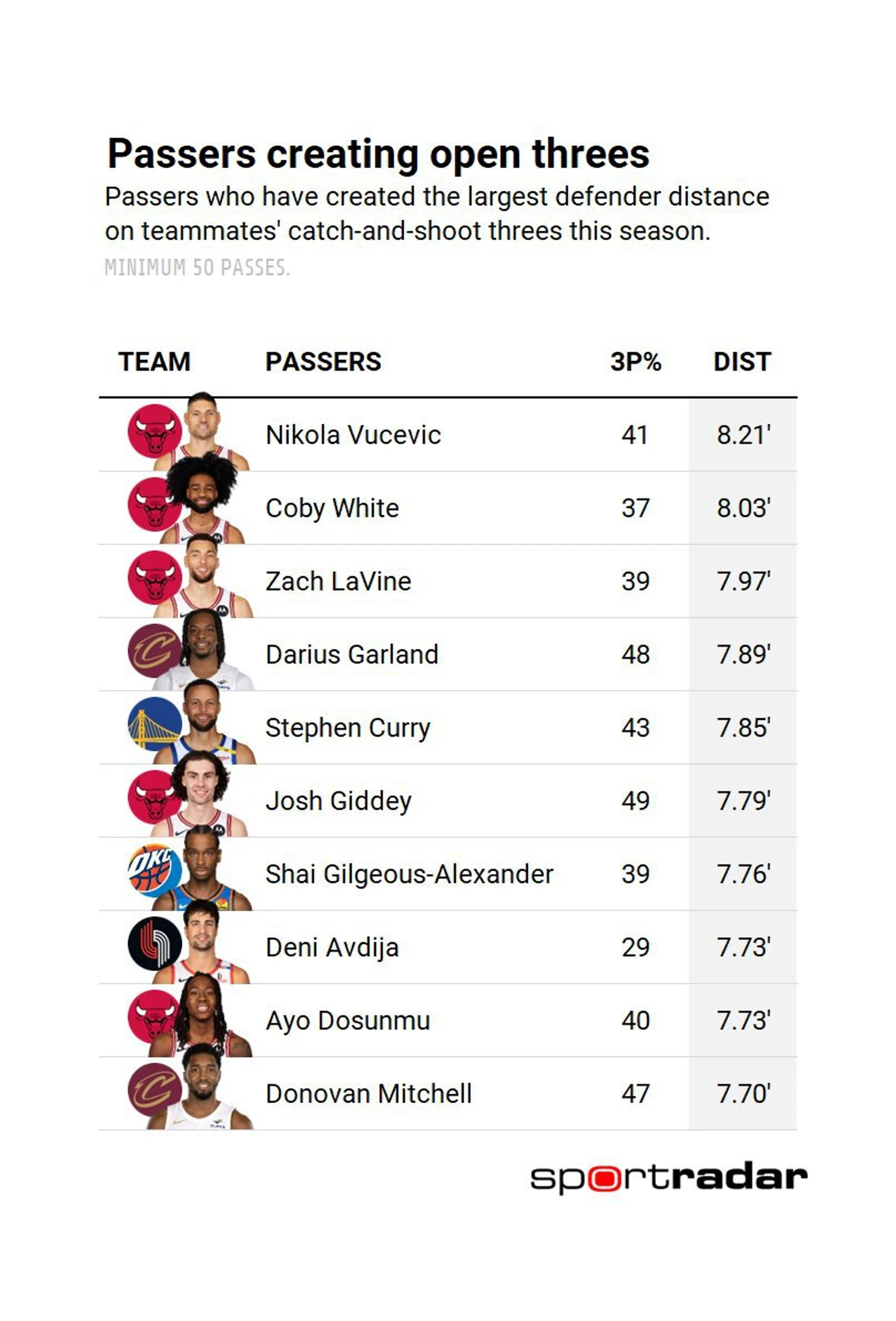 Представляющие «Чикаго» Никола Вучевич, Коби Уайт и Зак Лавин лидируют в сезоне НБА по созданию открытых 3-очковых для партнеров.