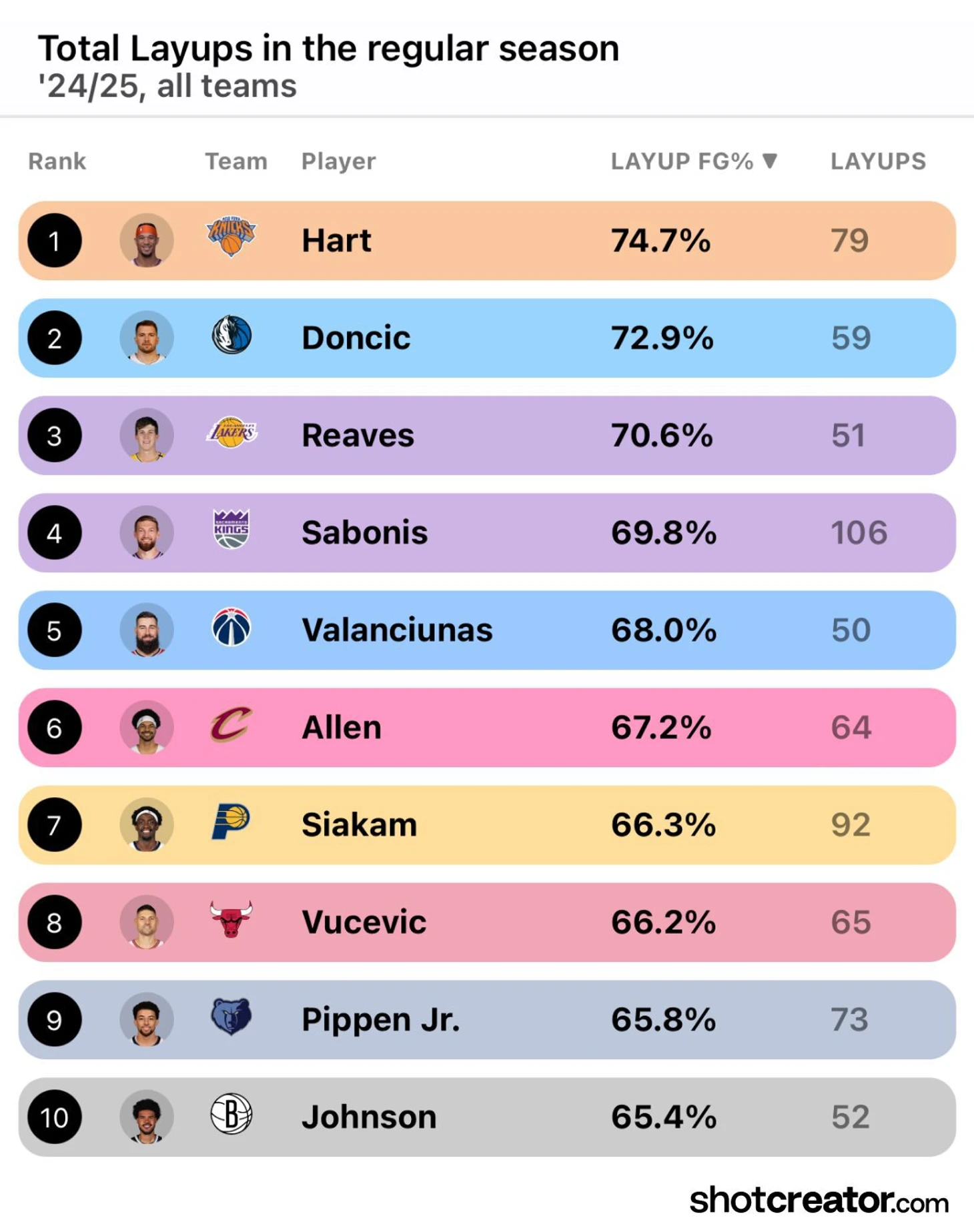 Джош Харт лидирует в НБА по проценту реализации лэй-апов, Лука Дончич – второй, Остин Ривз – третий