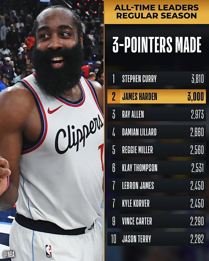 Джеймс Харден стал вторым в истории НБА, кому покорилась отметка в 3 тысячи точных 3-очковых