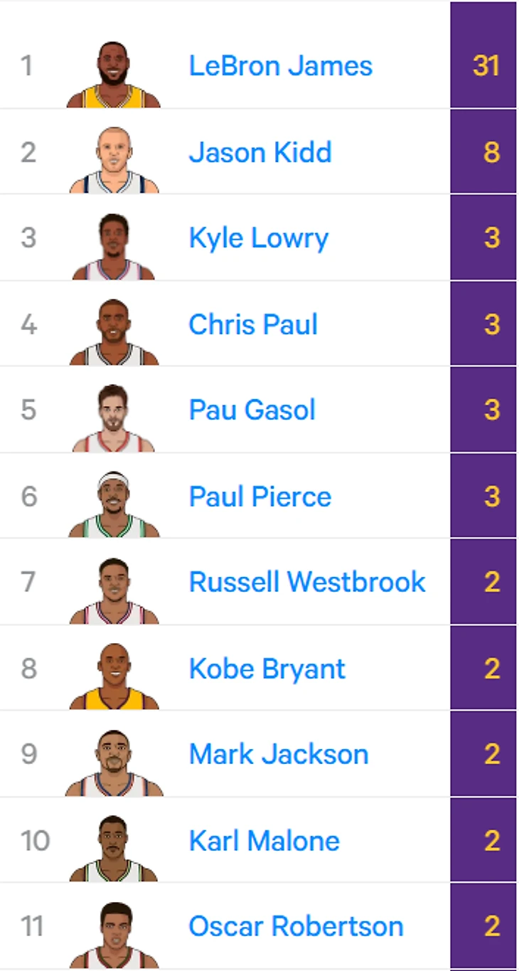 У Леброна больше трипл-даблов после наступления 35 лет (31), чем у следующих 10 игроков в данном списке вместе взятых.