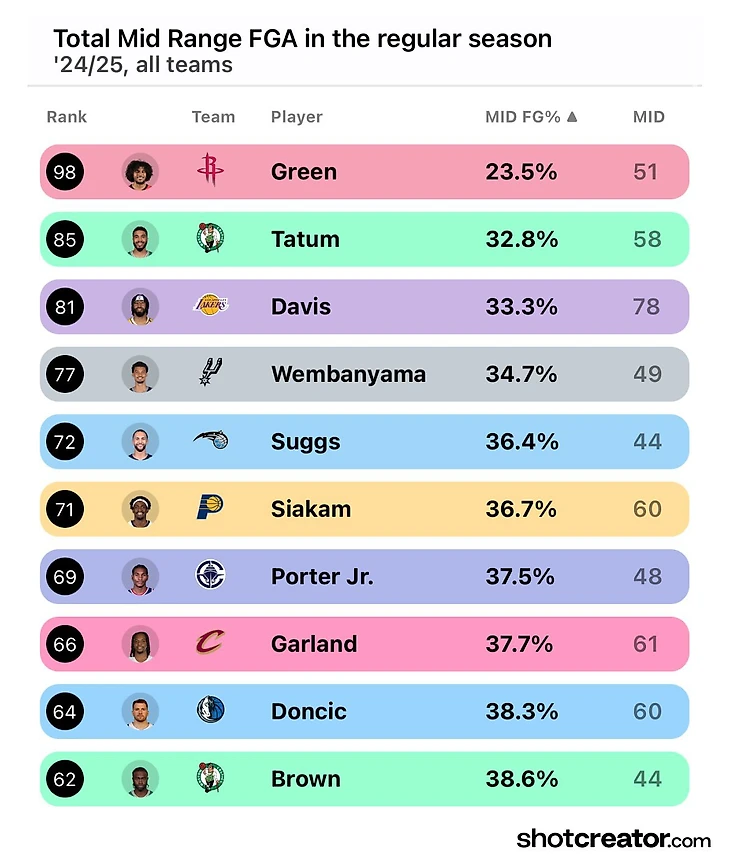 Джейлен Грин – самый неэффективный шутер со средней дистанции, Джейсон Тейтум – на втором месте