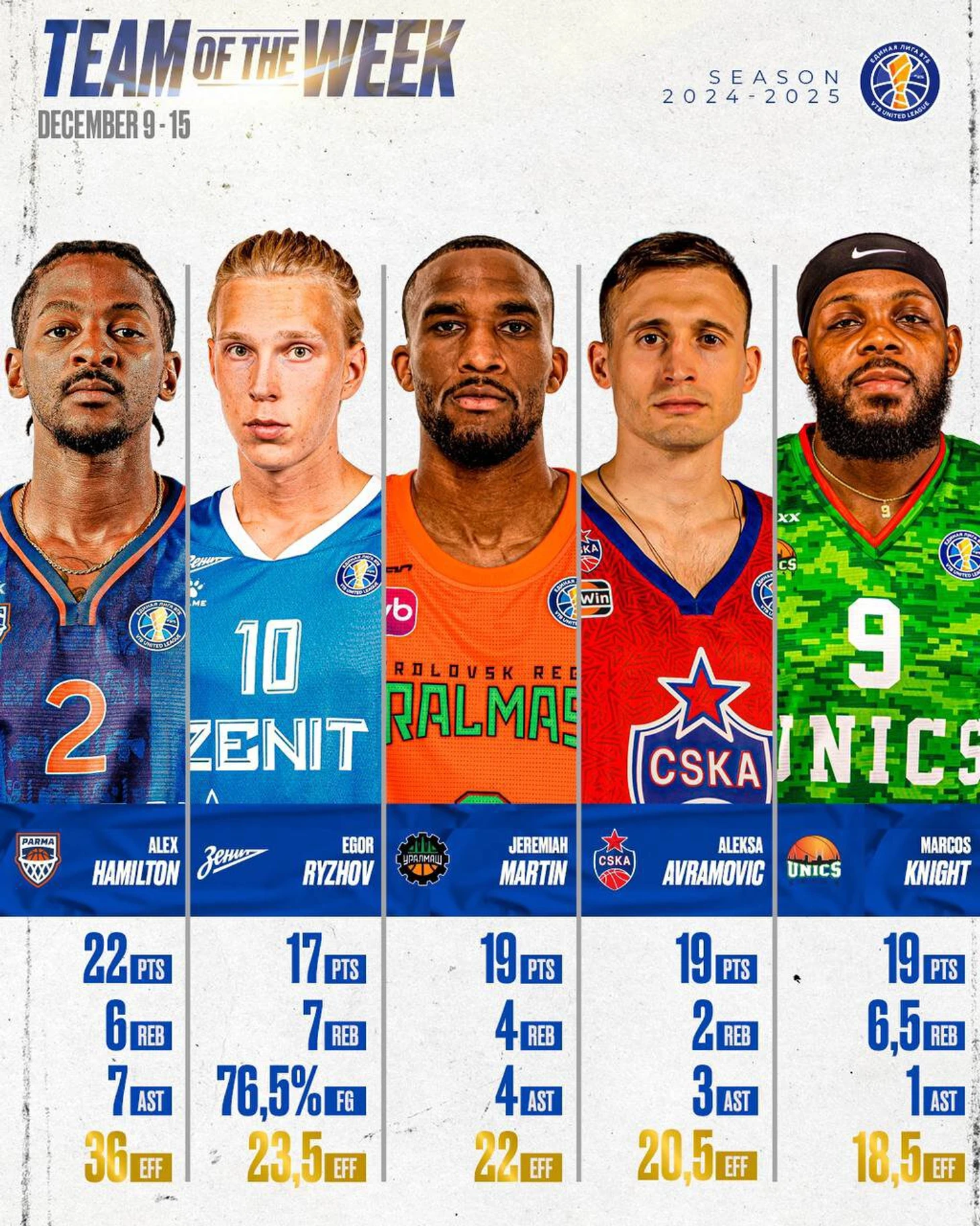 В пятерку лучших игроков по итогам матчей 9-15 декабря вошли Егор Рыжов («Зенит»), Алекс Хэмилтон («Парма»), Джеремайя Мартин («Уралмаш»), Алекса Аврамович (ЦСКА) и Маркос Найт (УНИКС).