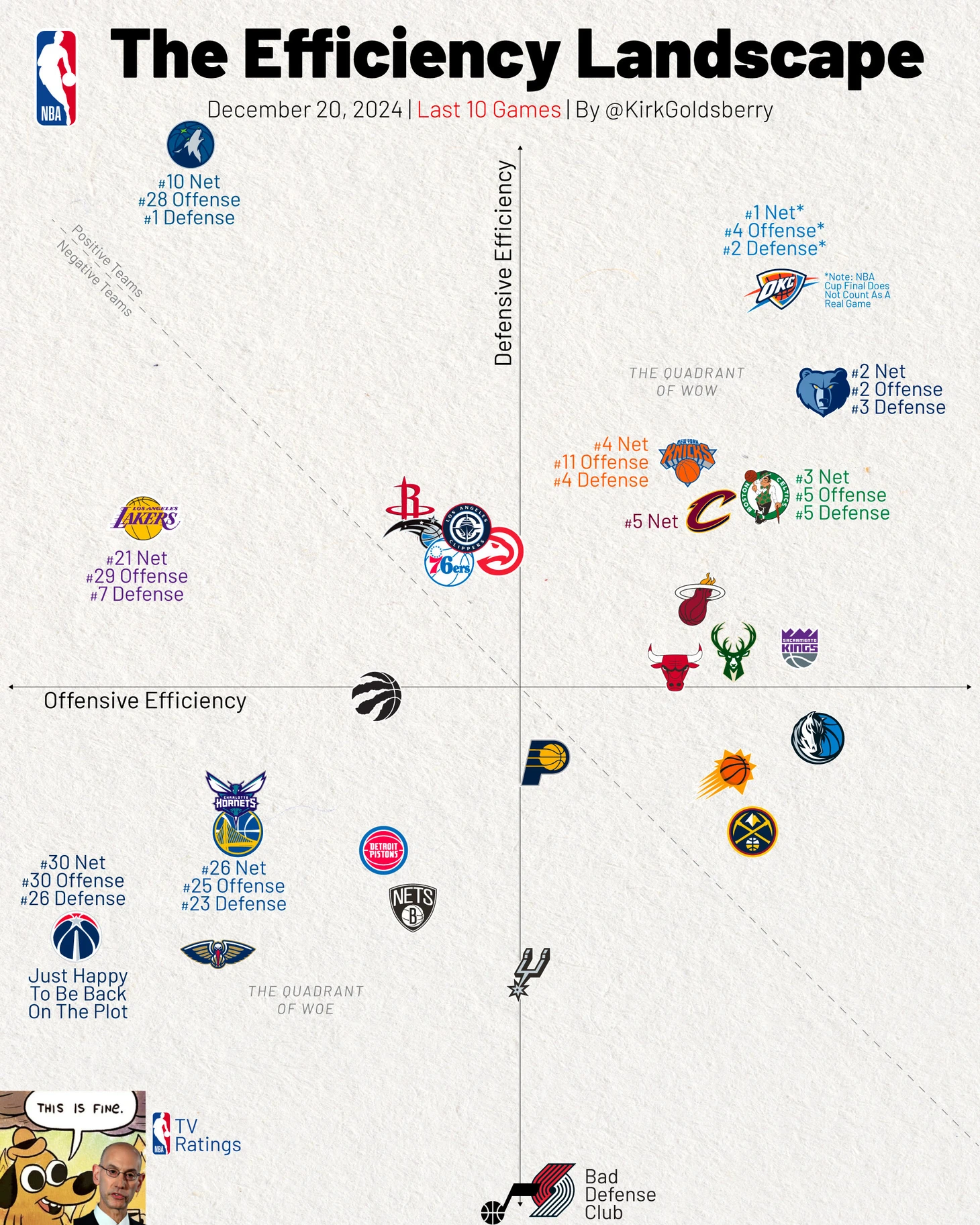 Аналитик Кирк Голдсберри выложил график эффективности клубов НБА.